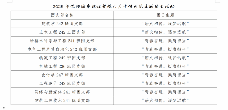 经过各基层团委推荐,校团委评审,最终,建筑学242班团支部,土木工程242班团支部等10个团支部脱颖而出,获评沈阳城市建设学院六月十佳示范主题团日活动。
