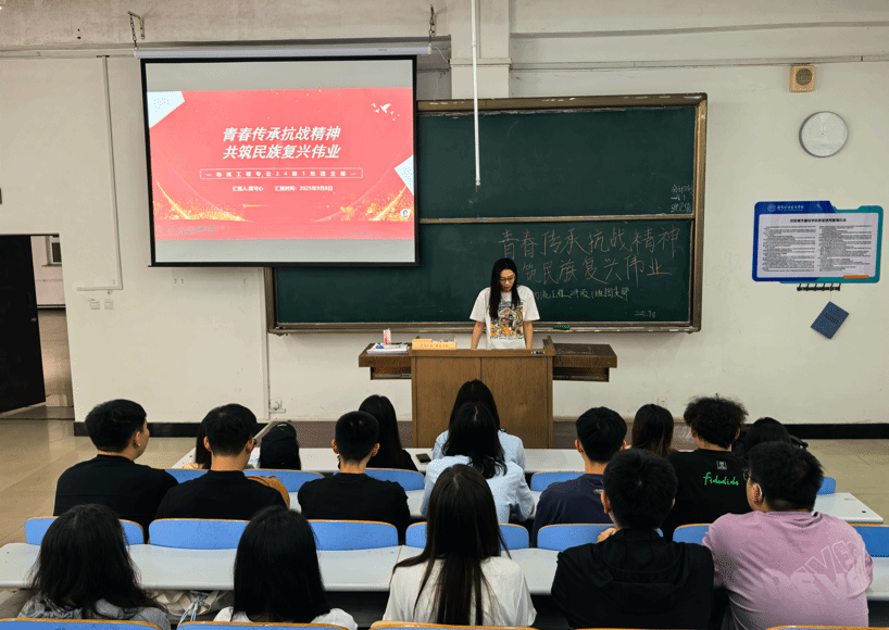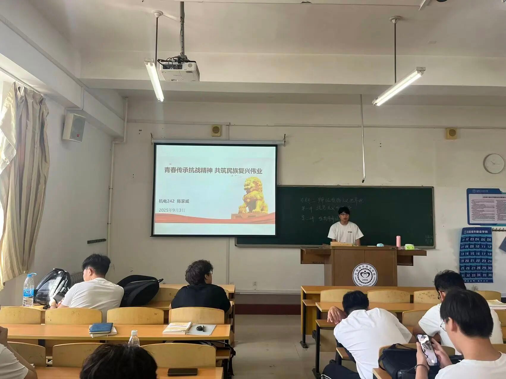 9月3日,机电242班团支部于业精楼D310开展了“青春传承抗战精神,共筑民族复兴伟业”主题团日活动。在团支书的带领下,通过系统学习与互动实践,帮助团员青年将个人成长与国家命运紧密相连,从抗战精神中汲取奋进力量,树立远大理想、锤炼过硬本领,在新时代主动担当起传承红色基因、助力民族复兴的历史使命,为实现中华民族伟大复兴的中国梦注入青春动能,同时进一步增强团组织的凝聚力、向心力和战斗力,强化团员的身份认同感与责任使命感。