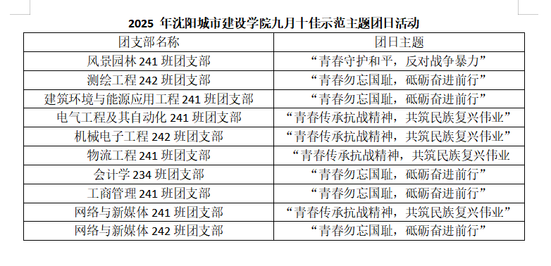 经过各基层团委推荐,校团委评审,最终风景园林241班团支部,测绘工程242班团支部等10个团支部获评沈阳城市建设学院九月十佳示范主题团日活动。