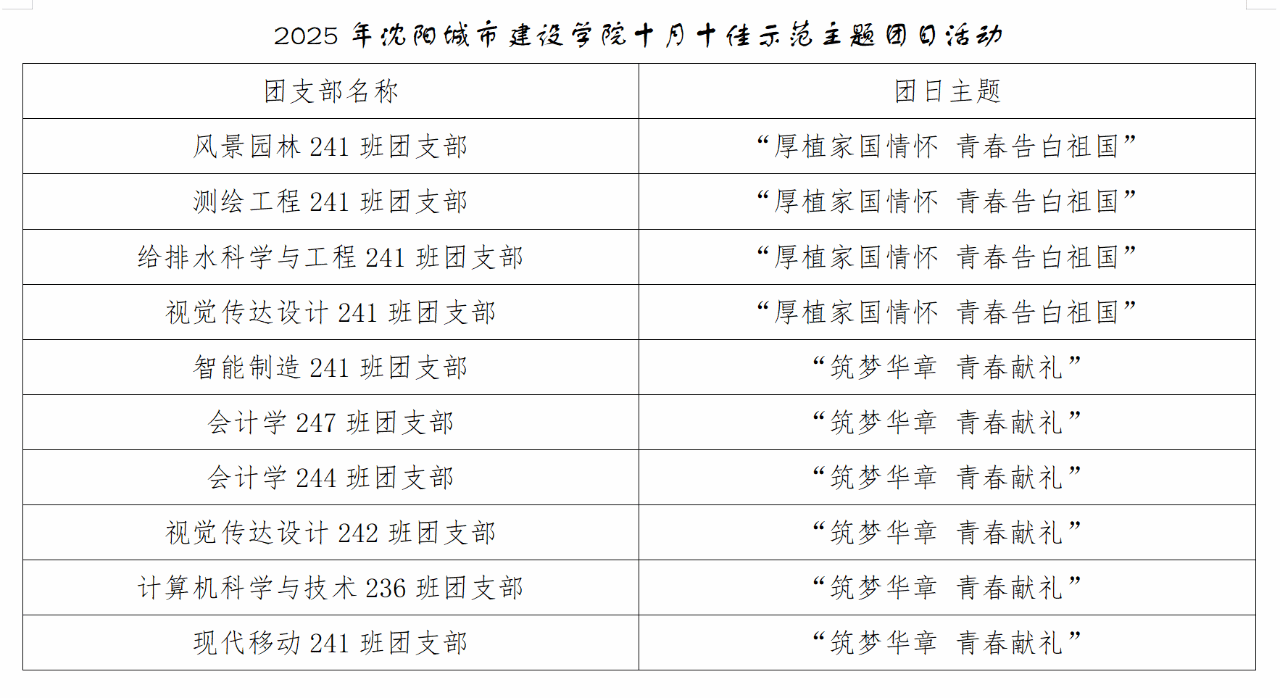 2025年十月,我校各团支部围绕“筑梦华章,青春献礼”主题团日活动,“厚植家国情怀,青春告白祖国”主题团日活动,“沈城秋韵,城建记忆”主题团日活动,积极准备、认真筹划,依托线下开展活动的方式充分展示了各团支部的风采。经过各基层团委推荐,校团委评审,最终风景园林241班团支部,测绘工程241班团支部等10个团支部脱颖而出,获评沈阳城市建设学院十月月十佳示范主题团日活动。